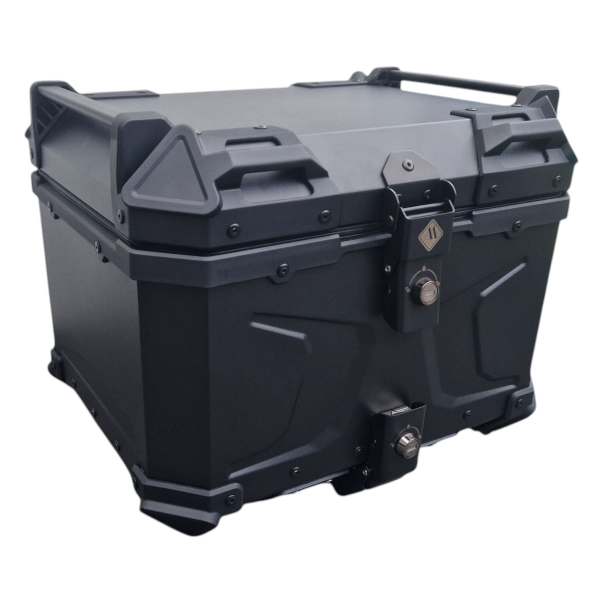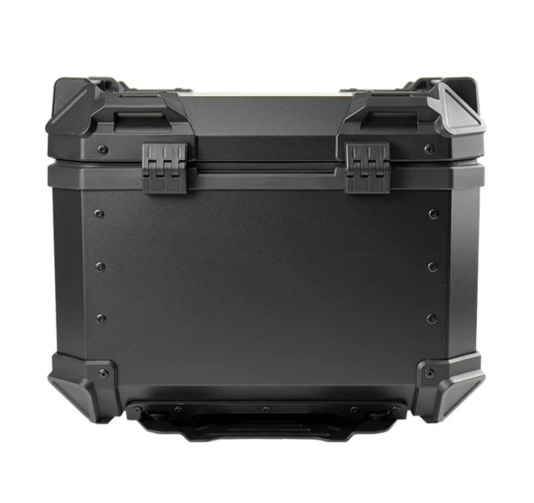 Stevige aluminium topkoffer voor op de motor. De koffer is voorzien van een zwarte gepoedercoate toplaag. De koffer heeft twee RVS snelsluitingen met sloten, waarmee u de koffer eenvoudig op de meegeleverde montageplaat kunt monteren of demonteren, en de topkoffer kunt afsluiten wanneer u deze achterlaat op de motorfiets. De topkoffer is water- en stofdicht en voorzien van stevige ABS hoekbeschermers.